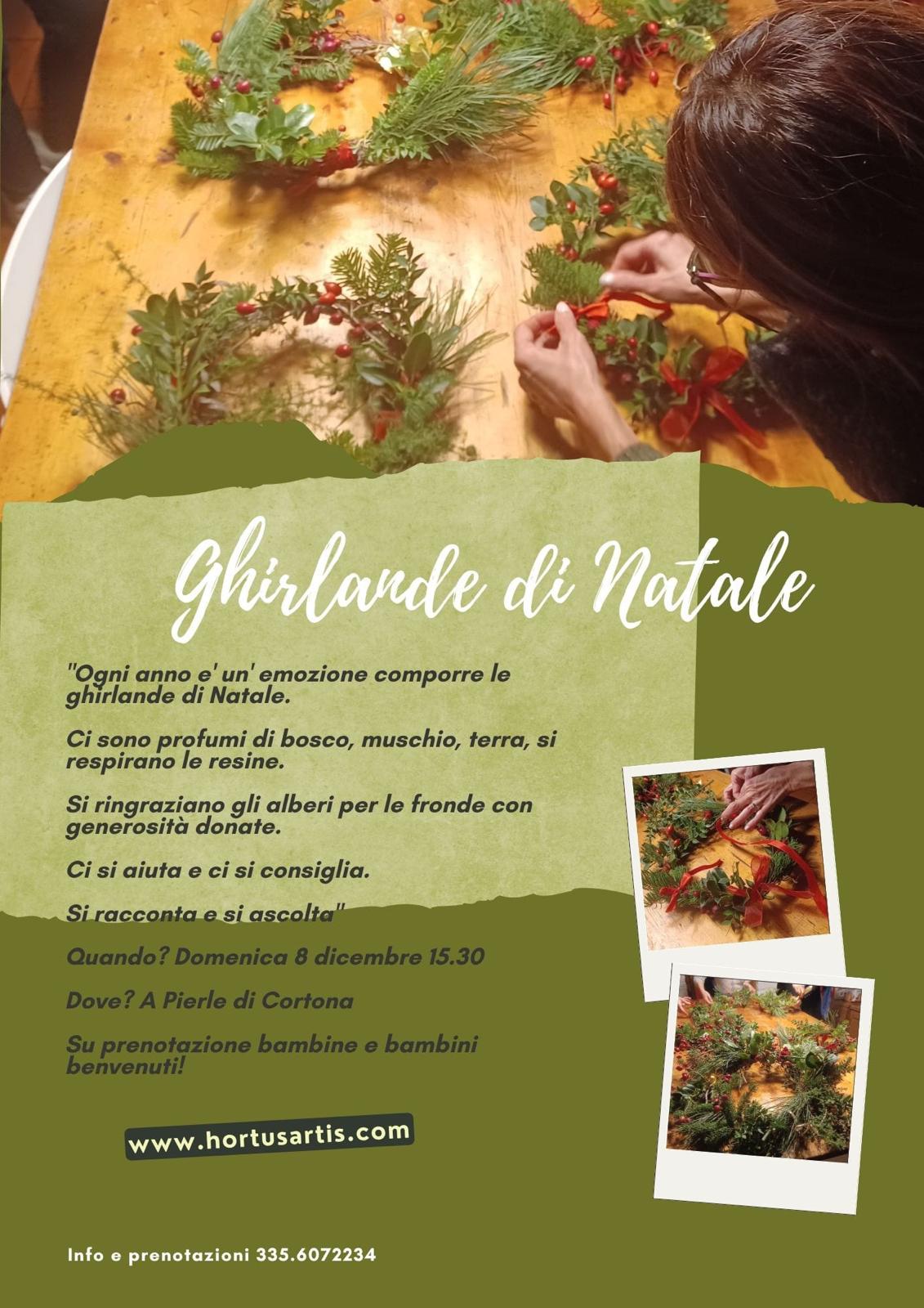 In questa pagina è presentata la locandina dei corsi di ghirlande di Natale che saranno svolti l'8 dicembre 2025 presso i Mercatini di Natale di Pierle. Essa riporta tutte le informazoni relative a queste attività.